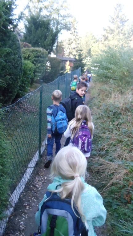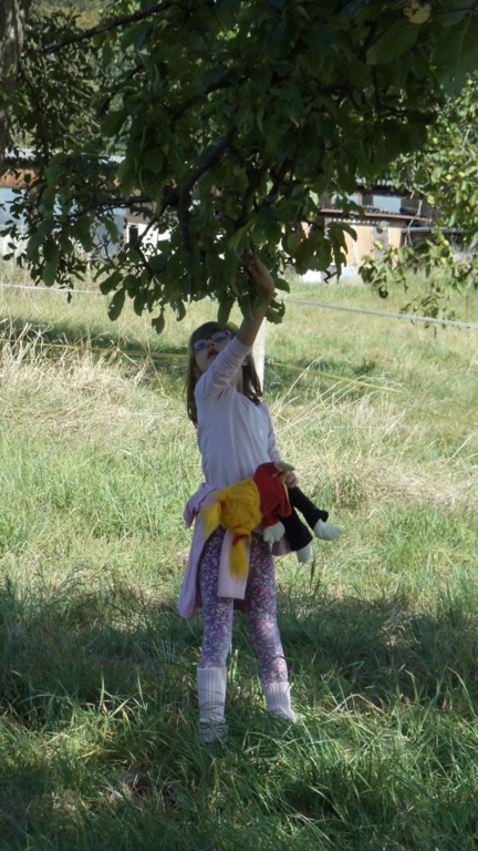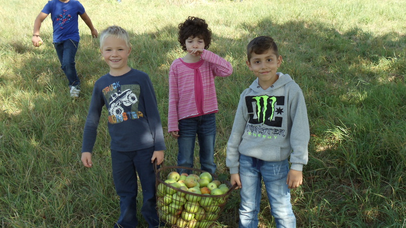Die Klasse 1b macht sich auf nach Klein-Gumpen zum Äpfellesen. Lara ist natürlich auch dabei.