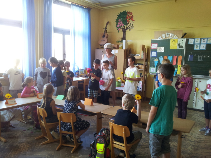 Am Freitag in der ersten Schulwoche hatten wir, die Klasse 1a, endlich unser erstes Treffen mit unserer Patenklasse 3b. Die Großen hatten für jeden kleinen Paten eine Blume mitgebracht, die uns noch die ganze nächste Schulwoche begleitet hat. Wir bekamen alle wichtigen Orte der Schule gezeigt, vom Hausmeisterbüro bis zum Computerraum, vom Schulleiterbüro bis zur Schülerbücherei.