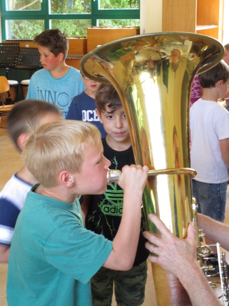 Am Mittwoch hatten unsere Erstklässler die Möglichkeit erste Eindrücke von Blechblasinstrumenten zu bekommen. Da wurde so einige Backen aufgeblasen und die unterschiedlichsten Töne klangen durch den Musikraum. Ob Posaune, Tuba, Horn,... die Kinder waren begeistert. Vielleicht war das der Angang für so einige Musikerkarrieren. Schön wäre es.....